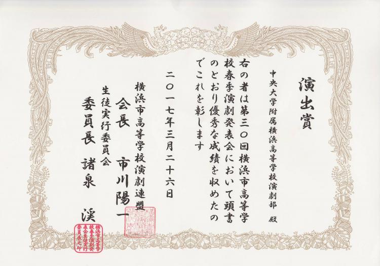 3月25日(土)に行わた第30回横浜市高等学校春季演劇発表会に脚本「土下座グランプリ」で出演しました。 小人数の部員で精一杯の演技をした結果『演出賞』を受賞することができました。 応援してくださった皆さん、そして何よりボランティアで活動を支えてくれた有志の仲間に感謝いたします。