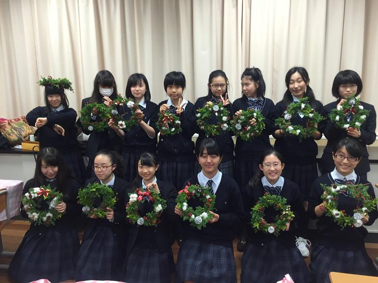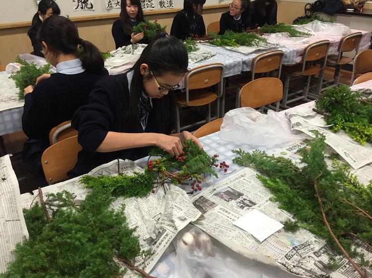 2学期最後の華道部の活動として、クリスマス・リース作りをしました。華道の先生の指導の下、ヒムロスギ、クジャクヒバ、サンキライ、赤つる、コットンフラワー、松かさ(シルバー)などの花材を利用して、部員は思い思いのリースを制作して楽しみました。