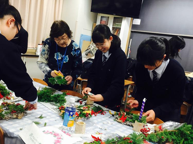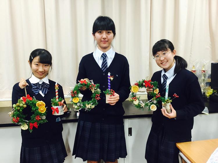 11月25日(金曜日)は今年最後の部活動ということで、生け花の先生方の指導の下、クリスマス・ムードを感じさせるリースとキャンドルの2種類の作品を制作しました。様々な花材を飾り付けて思い思いのリースを作りました。また、普通のキャンドルにテープを巻き付けたり、油性ペンで好きな絵を描くなどして、非常にカラフルなキャンドルを仕上げました。