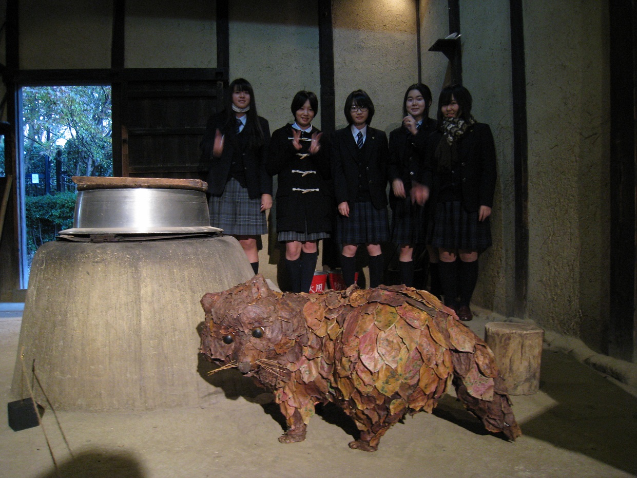 ・タヌキは、竹で骨組みを作り、柿の葉を貼り付け制作しました。とてもリアルにでき、他校の先生方やお手伝いをいただいているボランティアの皆様から「さすが中大!」とお褒めの言葉をいただきました。
