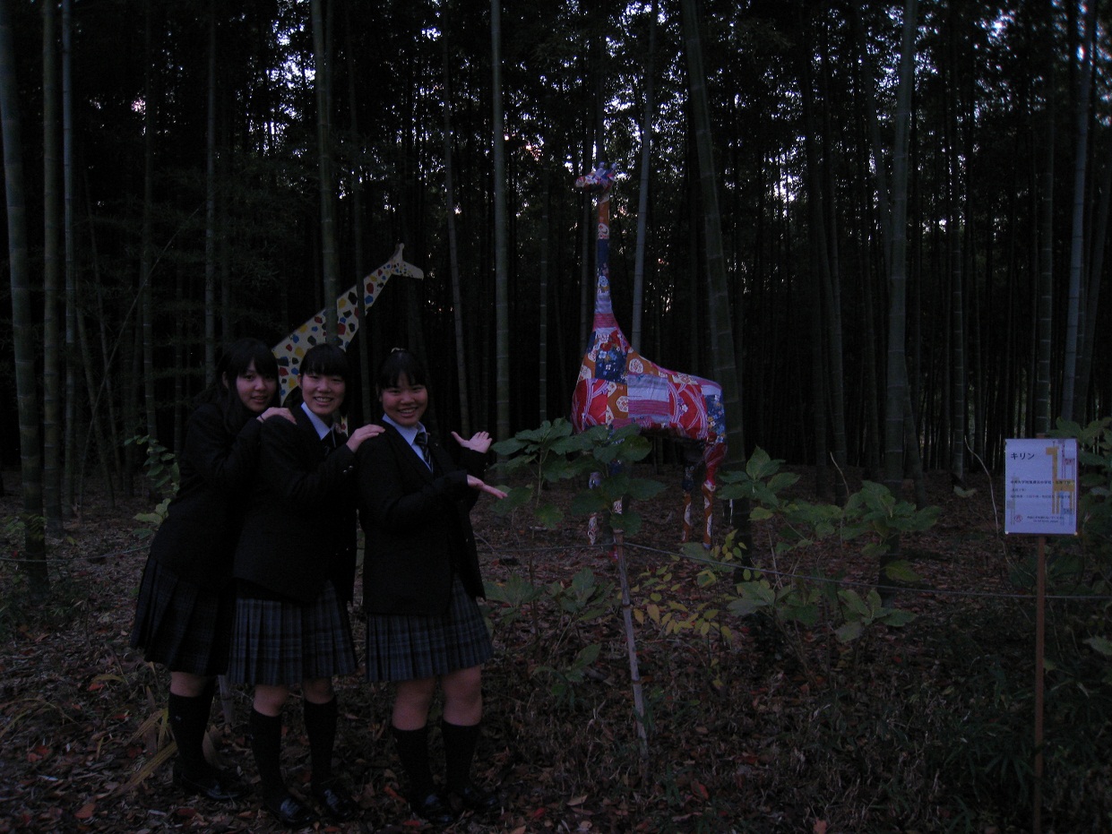 ・竹林に竹を3メートルの高さに切り、それを柱に骨組みを作り、布をパッチワークにしカラフルなキリンを制作しました。