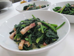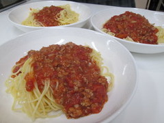 2月14日(土)、ミートパスタ、ほうれん草とベーコンのソテーを作りました。