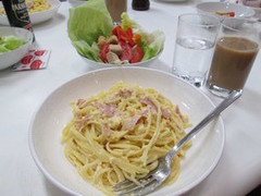 1月17日(土)、お昼ご飯にカルボナーラ、サラダ、プリンを作りました。