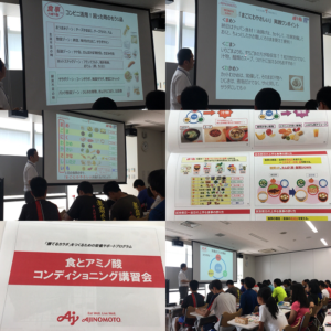 18日終業式も終わり、午後からajinomotoの方に来ていただきアスリートの為の栄養セミナーを約2時間半にわたりしていただきました。毎年この時期に実施して今年で3年目。選手も栄養について日頃からだいぶ意識をして生活できるようになってきました。
