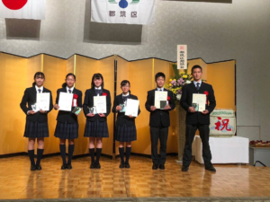 1月6日 新横浜プリンスホテルで行われた平成30年度都筑区スポーツ賞に高3平岡昌敏、高2吉川絢斗、富樫莉佐子、高1林 美玖、中2府川日菜多、伴野美結が選出され、都筑区長様より賞状、盾をいただきました。これからも更に精進してまいります。