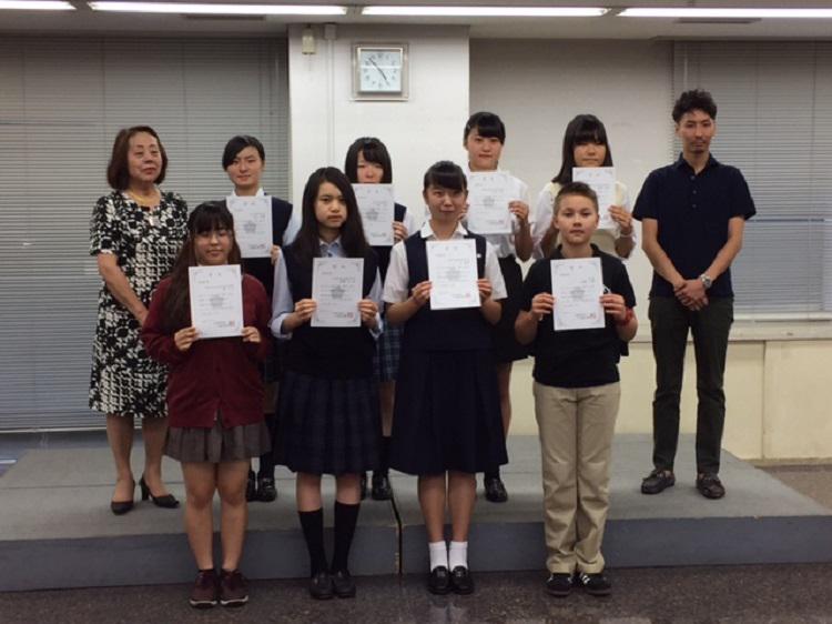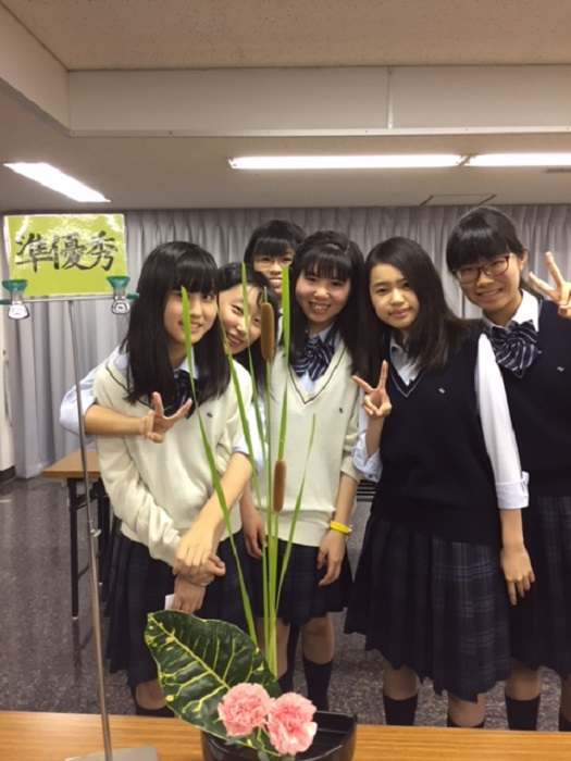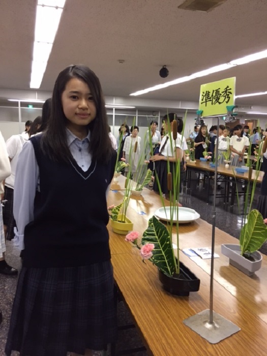 本校からは中学生7名、高校生7名が参加し、その中で、本校から初めて中学3年生の深瀬萌々佳さんが準優秀賞に輝きました。ちなみに優秀賞(290~300点)は3名、準優秀賞(280~285点)は8名のみに授与されました。その8名のうちの一人に選ばれたのは大変名誉なことです。競技会の最後に小原流の家元の小原宏貴氏との記念写真も撮影しました。さらに、佳作(265~275点)を受賞した102名の中に本校の3名も含まれました。
