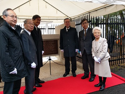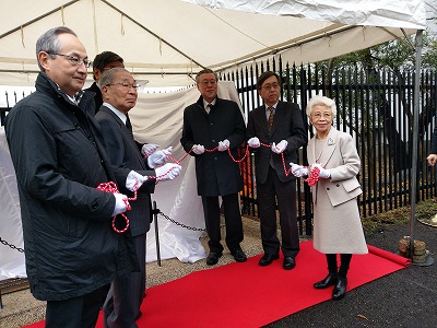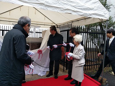 3月7日、雨でしたが除幕式の一瞬雨も上がりお日様に迎えられ、かけ声宜しく生涯の一番幸せなひと時、涙溢れる思いを託し紅綱を引かせていただきました。私は渡邊多満様が、この良き日を共に喜び祈りを捧げてくださったのではないかと夢想してしまいました。