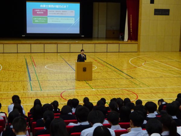 11月6日(火)6校時、体育館において高校1年生を対象に「法職講座」を行いました。