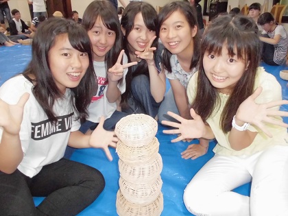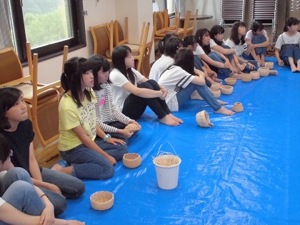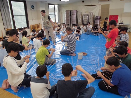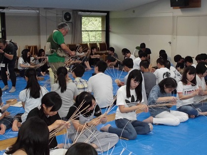開校式の後は、工芸体験をしました。水に浸して柔らかくなった籐をインストラクターの方の指示に従って、編んで曲げていきました。なかなかうまくいかなかった人もいるようですが、約2時間後にはそれぞれの籠が出来上がりました。皆、やり切った満足感に溢れているようでした。