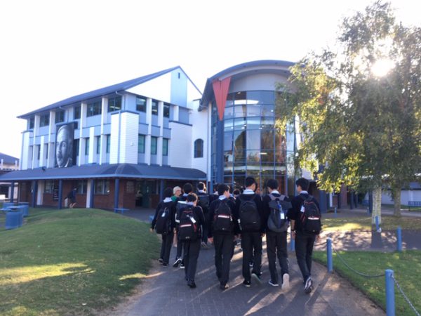 男女とも最初はオリエンテーションとして校内を案内してもらいました。オリエンテーション後は、男子校はバディと一緒の授業に参加しました。初日なので顔を合わせたときは生徒もバディもお互い少し緊張した面持ちでした。本日は4コマ(1コマ50分)の授業を受けました。理科や社会などのこちらの授業を受けて、日本との違いを体感したようです。