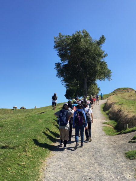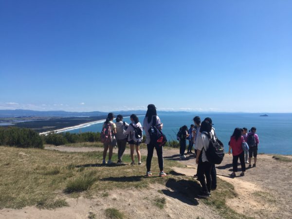 女子校は、学校の敷地にある森でニュージーランド固有の植物を探し、プケコというくちばしが赤く羽根が青い鳥も見たりすることもできました。その後は英語クラスの教室で担当のバーク先生の授業を受けました。本日は三者面談の日で学校の授業がないので、女子は全員でMount Maunganuiのハイキングに出かけました。約90分間のハイキングでしたが羊が見られたり、きれいな海が見られたりとニュージーランドの自然を存分に感じることができた時間でした。