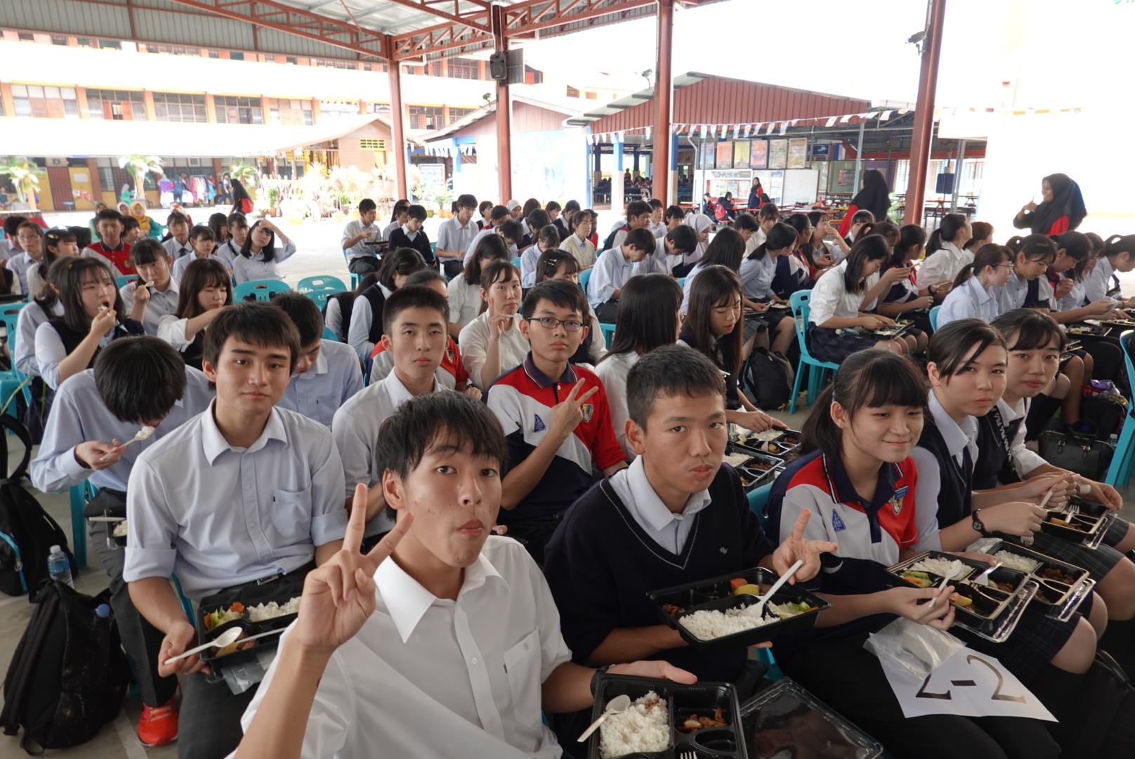 私たち、高校2年生第一団(1,2,7,8組)は、10月31日(木)は、マレーシアに渡り、現地のSMKスクダイ高校との学校交流を行いました。互いに出し物を披露し、レクリエーションでは楽しみながらコミュニケーションをとる姿が見受けられました。途中、突然のスコールにも遭い、日本との気象の違いに驚いていました。同年代の異国の人との交流はとても刺激的で、英語を使って気持ちを伝えられたことにも満足感が得られた様子でした。