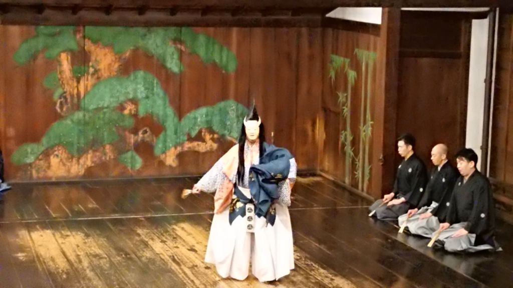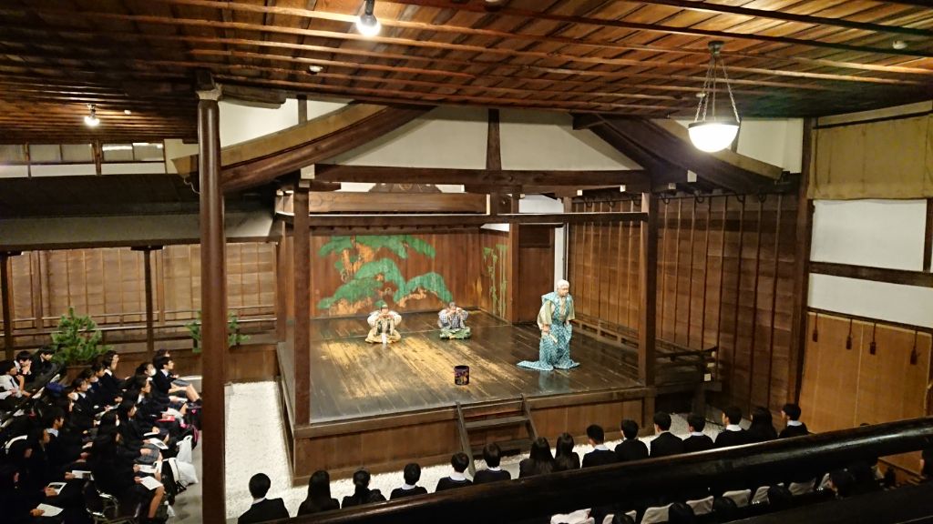 京都のホテルへ到着後、夕食をいただき、「古典芸術鑑賞」のために大江能楽堂に向かいました。狂言は「附子」、能は「敦盛」を鑑賞しました。それぞれ大江能楽堂の方から丁寧な説明をしていただき、能面をつける「体験」もさせていただきました。同じ舞台で演じられる狂言と能の違いを体験し、日本独自の芸能に触れることができた貴重な時間でした。