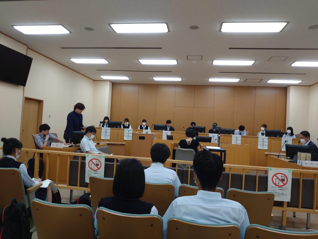 当日は裁判員制度の説明の後、実際の法廷で模擬公判として本校の生徒が裁判官・裁判員役を担当させていただき、その後裁判官の方と3つのグループで模擬評議を行いました。