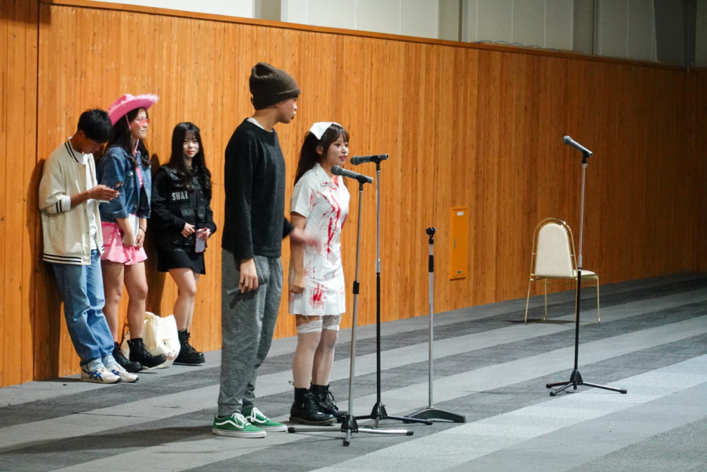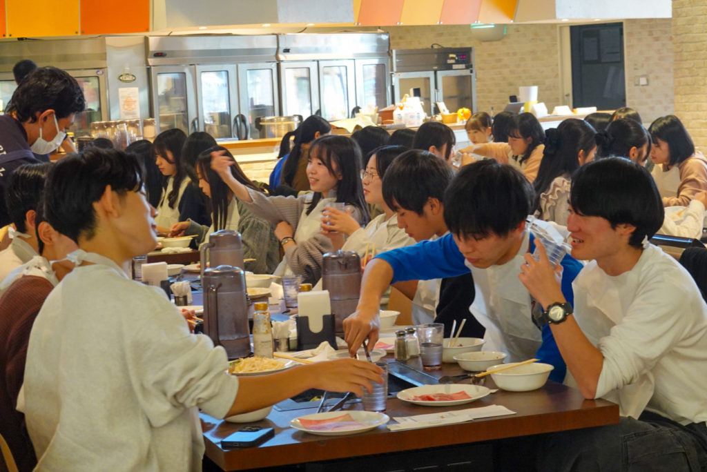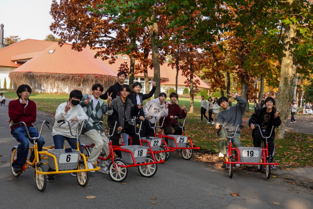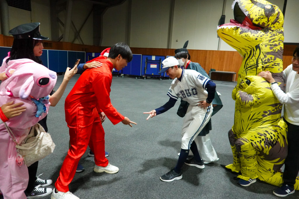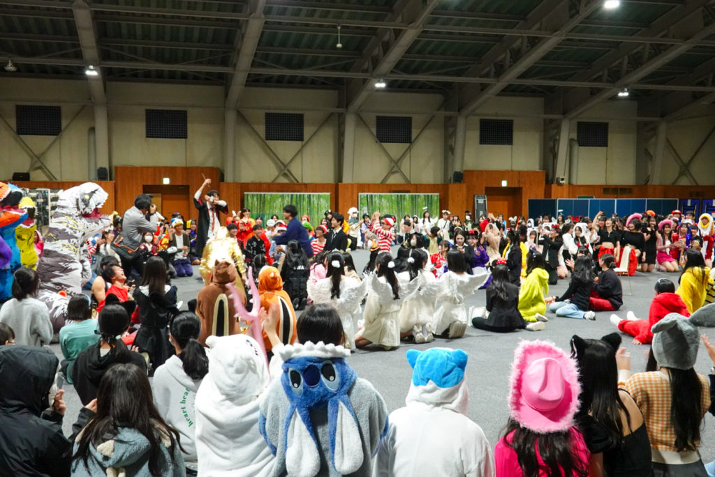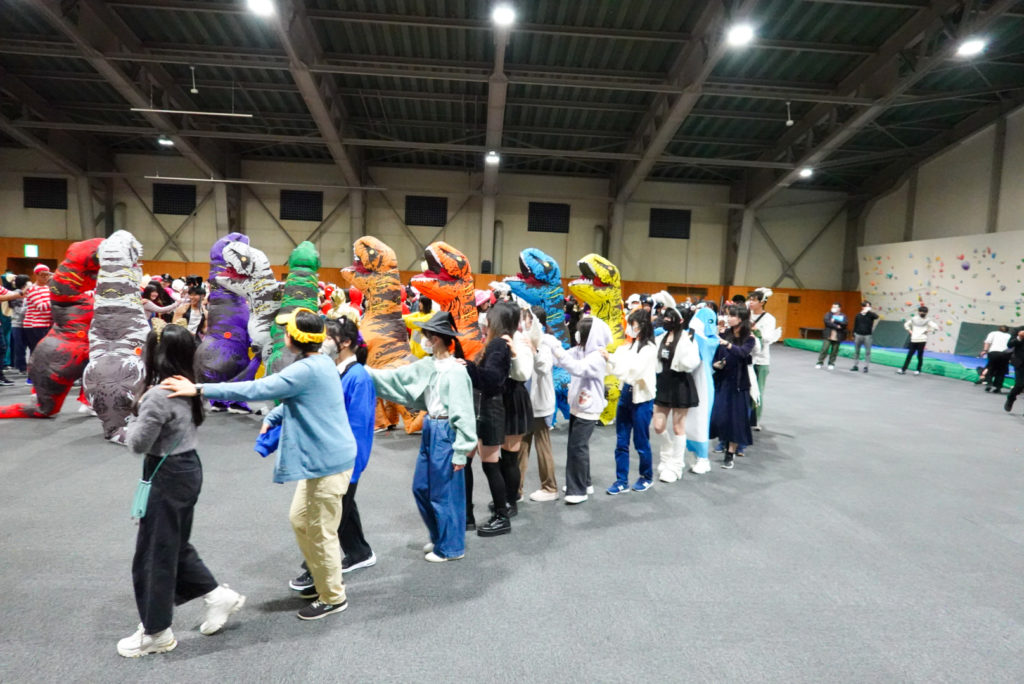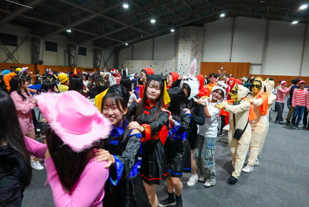 その後、バスで2時間程かけて、ルスツリゾートホテルへ移動しました。ホテルの夕食はビュッフェスタイルで、蟹などを堪能しました。夜は旅行委員企画のオリエンテーションを行い、ハロウィンの仮装をしながら「人間ビンゴ」「ジャンケン列車」で盛り上がりました。
