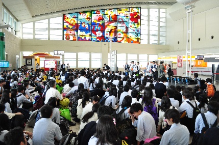 生徒だけで那覇空港に集合し、前半と後半に分かれて羽田空港へ。さすがに夕方の便でさすがに5日間の疲れがたまっているので静かなフライトか…と思っていましたが、元気に旅の思い出話に花を咲かせている生徒もいました。