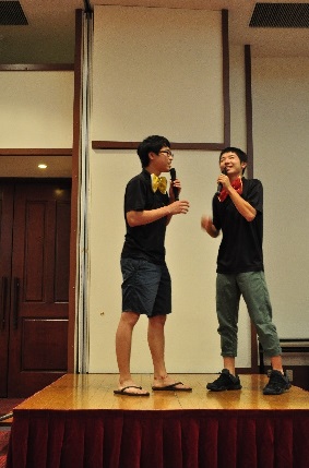 夜ホテルでは、学年でレクを行いました。出し物(漫才)などで大いに盛り上がりました。