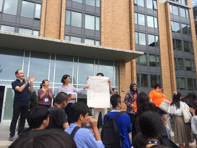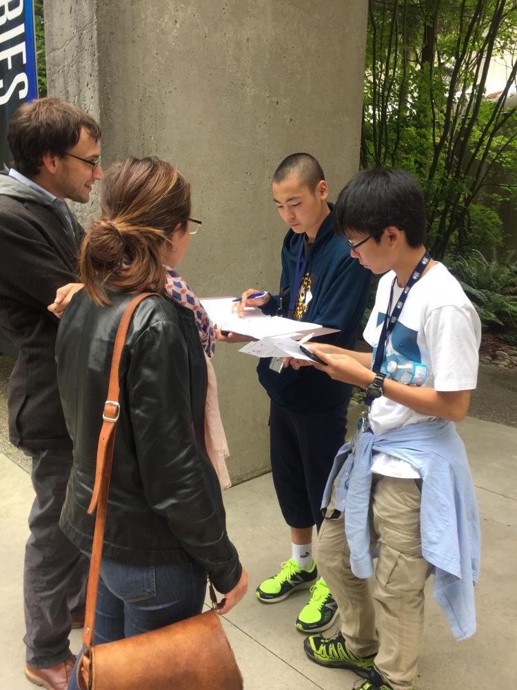 本日も午前中は通常授業で、昼食前にはインタビューの宿題を頑張っている生徒が多くいました。午後からは、「サバイバル英語」が実施されました。生徒達は班毎に指定されたUBC内の施設をバディと一緒に回って、質問に答えたりグループ写真を撮影し、帰着時間と質問への正解数によって順位が決定されました。そして、上位入賞を果たした班には賞品が授与されました。