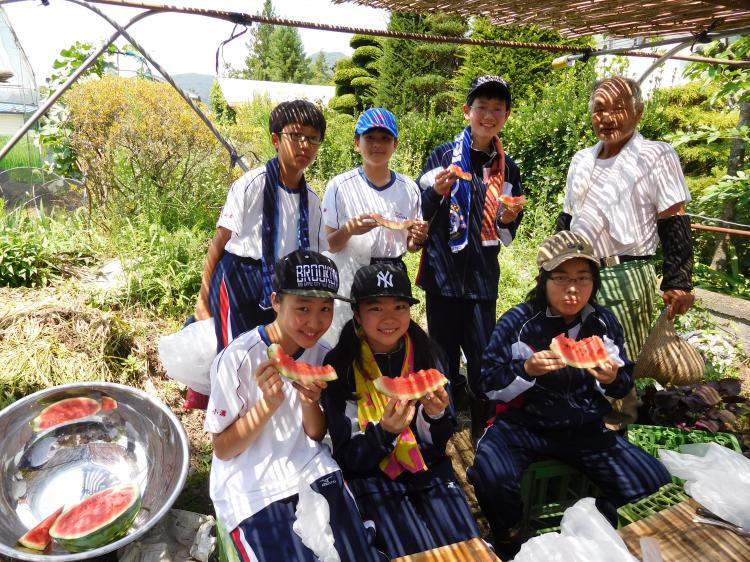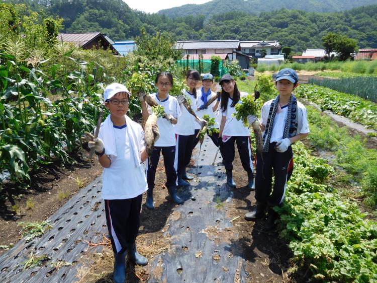 2日目の今日は、各クラス5~6人の班ごとに農家のお宅にお邪魔し、農業体験や自然散策を行う、「せいしゅん村」ほっとステイプログラムに参加しました。鍬を使って畑を耕したり、野菜の収穫をしたり、牛の世話をしたりと、家庭によって内容は様々でしたが、どれも都会では決して経験できない貴重な体験で、生徒は多くの学びを得たようです。気温も高く、日差しも強かったので、午後は多くのご家庭が川遊びに連れて行って下さいました。午前中たくさん動かした体を冷たい水で癒し、リフレッシュできたようです。明日の最終日も、6種類の体験プログラムを通して、まだまだ長野の自然を満喫します!(中学1年学年会)