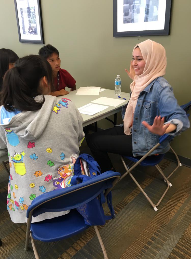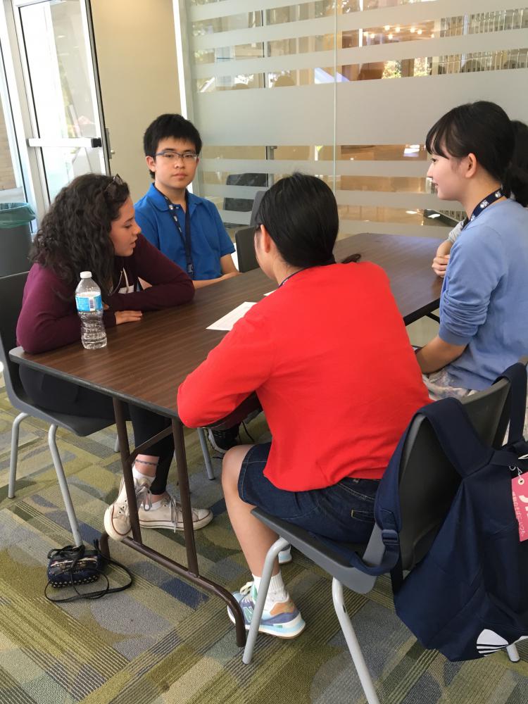 午前は昨日のインタビューについて、得た情報やうまくいったこと等を仲間と共有しました。その後は英会話タイムに向け質問を考えました。英会話タイムとは、カナダ在住のゲスト1人と、生徒4人でグループを組み、15分ずつ会話をしていく活動です。どのグループも、8名のゲストの方と交流することができました。
