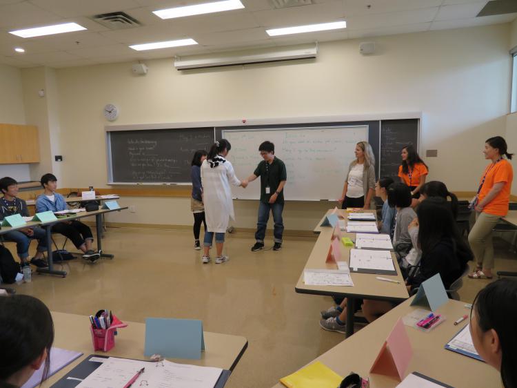 キャンパスツアー終了後、ネイティヴの先生方や授業アシスタントのバディとの顔合わせをしてすぐに、時差ボケの疲労も忘れてしまうくらい楽しいコミュニカティヴな授業が始まりました。本校生徒のために独自開発されたテキストを使い、教室での練習と教室外での実践を通して英語を学びました。