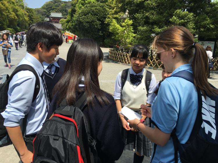 元気に校外研修をしています。現在、本校ではニュージーランドからの留学生を迎えております。その留学生は、本日、鎌倉校外研修に参加しています。留学生とともに行動をしている班は、英語を駆使し、がんばってガイドをしているようです。