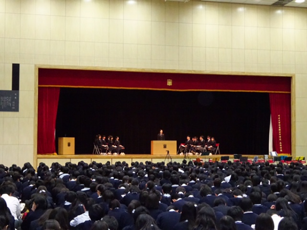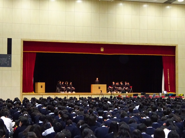 12月18日(金)、終業式の日に校内レシテーション・スピーチコンテストを開催しました。これまでの英語の授業で中学生はレシテーションの練習、高校生は自作のスピーチの発表を行ってきました。この日は学年代表に選ばれた中学生6名と高校生8名が全校生徒の前で成果を披露し、中学生は表情豊かなレシテーションを、高校生は自身の強い思いのこもったスピーチを発表してくれました。どの生徒も堂々としたすばらしい発表でした。