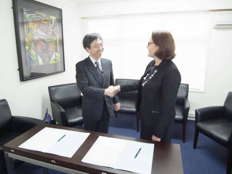 25日にはノースコート・カレッジ(Northcote College)のビッキ・バリー校長先生(Ms. Vicki Barrie)と交流協定に調印を行いました。同校からは、昨年4月に生徒一行が本校を訪問し、本校生徒の家庭でホームステイをしながら、バディ(ホームステイ受け入れ家庭)生徒の教室で日本の授業を体験したり、中学2年生の鎌倉校外研修に参加しました。それ以来、交流を模索してまいりました。今後、ノースコート・カレッジと本校は提携校として、より緊密な相互交流を行うことになります。