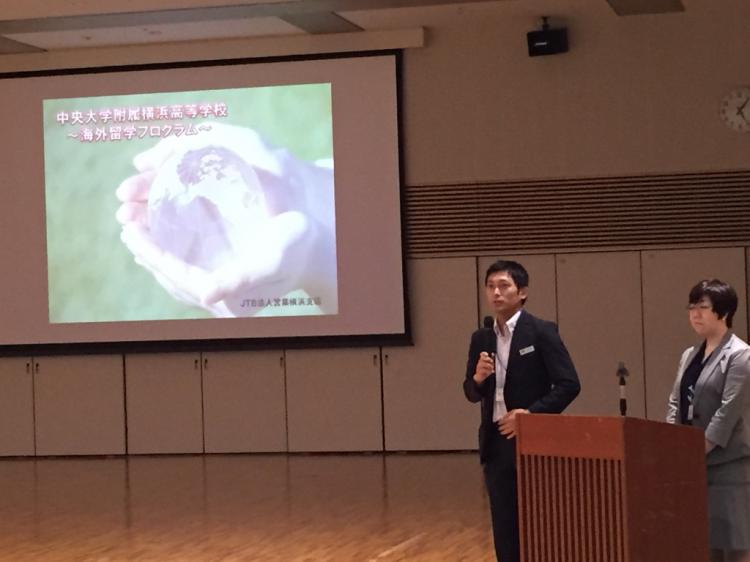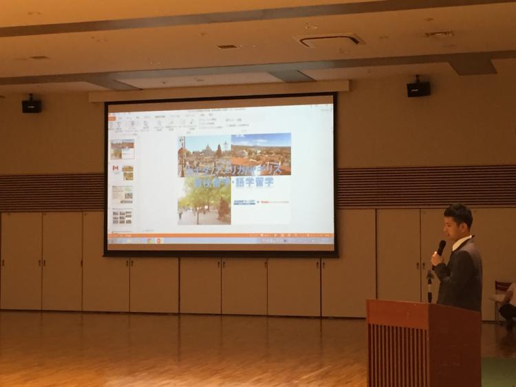 第一部では、学校長の挨拶につづき、学校担当者から留学制度の説明をいたしました。ついで旅行社3社のご協力を得て、注目度の高い「学期(ターム)留学」の具体的な候補地を中心に、スライド等を用いながら具体的に留学先を紹介するプレゼンテーションをしていただきました。