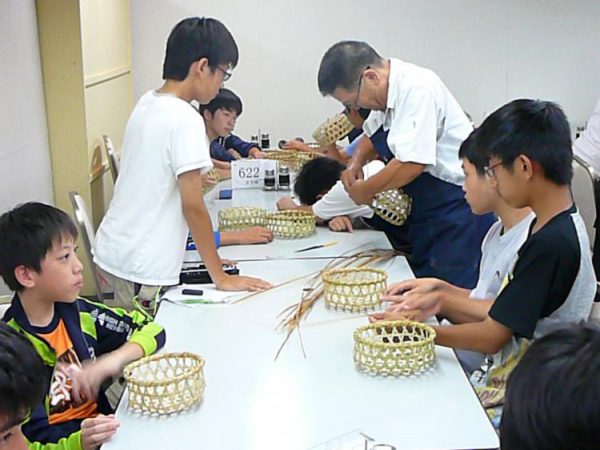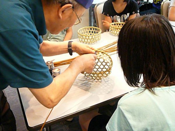 夕食後は、根曲り竹を使った籠作りの、仕上げの部分の作業をする体験をしました。