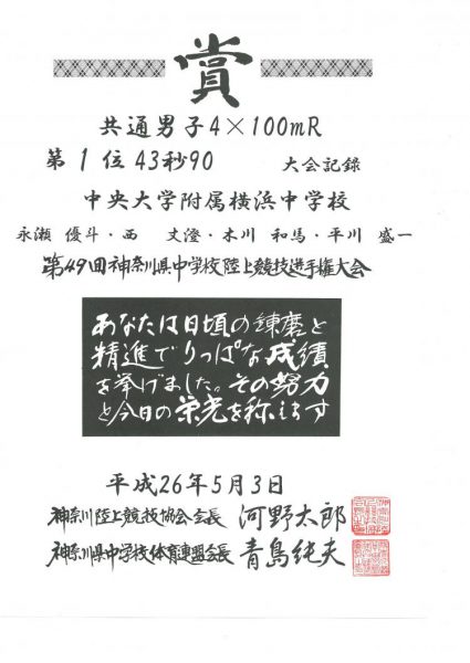 5月3日に横浜市三ツ沢公園陸上競技場で行われました 第49回神奈川県中学校陸上競技選手権大会において 男子4×100mRで永瀬・西・木川・平川のメンバーで 43″90の大会新記録で優勝致しました。 また、中学三年生の西君は200mで23″35で第5位 400mでも51″67のタイムで第3位にそれぞれ入賞致しました。 次の通信陸上に向けて頑張ります。応援よろしくお願い致します。