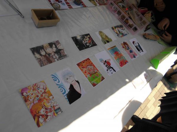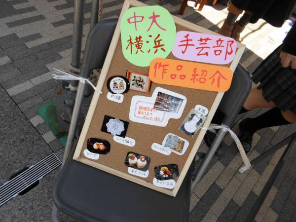 本校の手芸部と作画研究部は、日頃の部活動で作成した作品を持ち寄り、1ブースを半分ずつ分け合って出店しました。作画研究部はポストカードなどを、手芸部はヘンプで編んだストラップを販売しました。