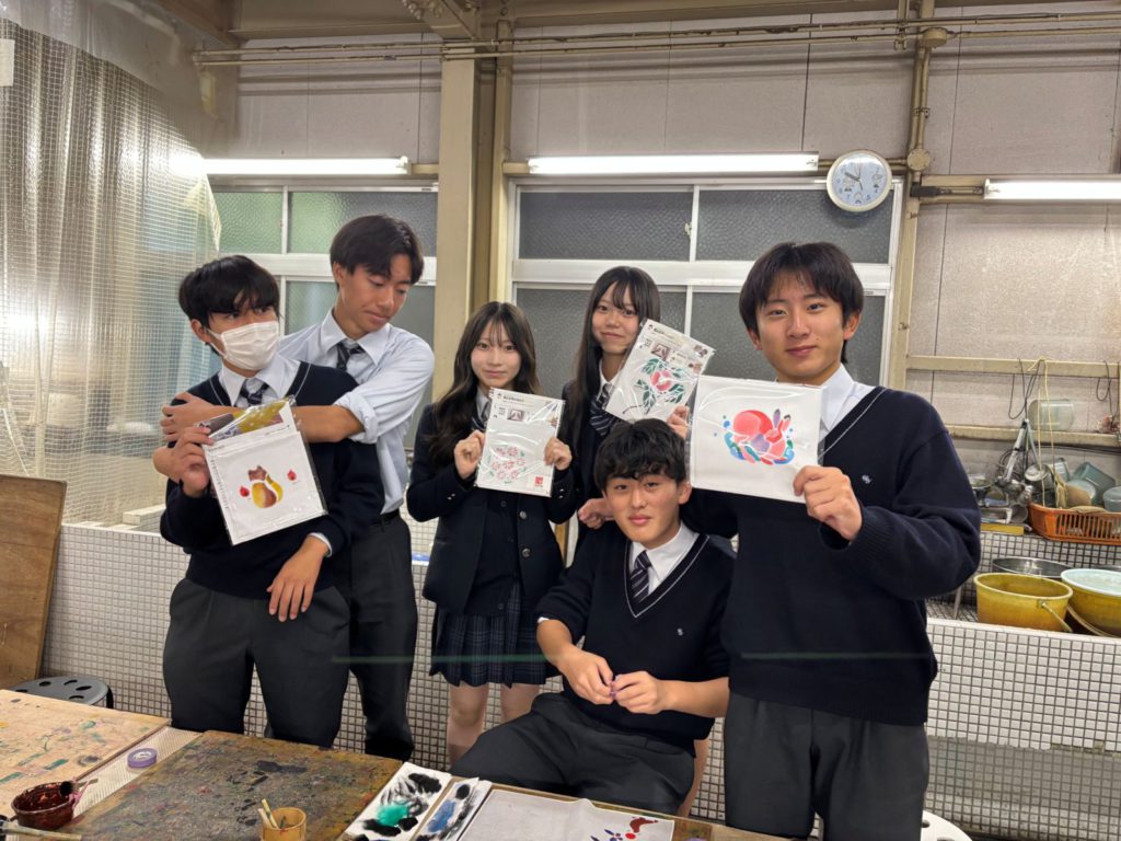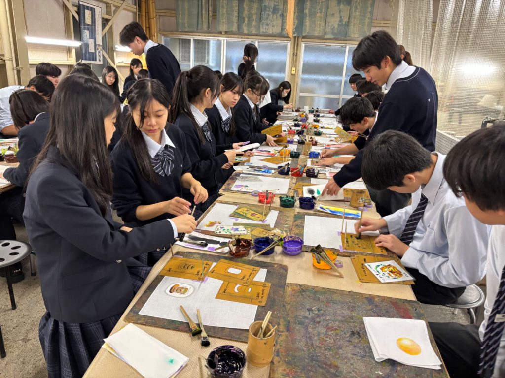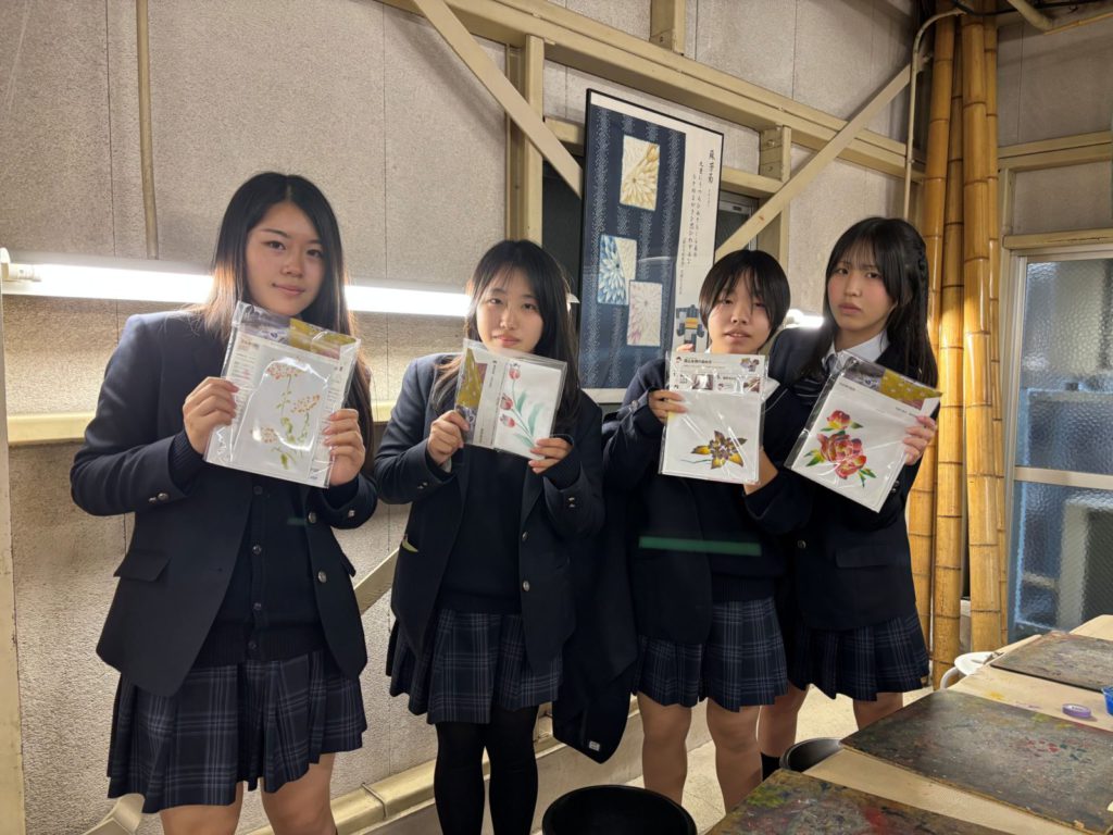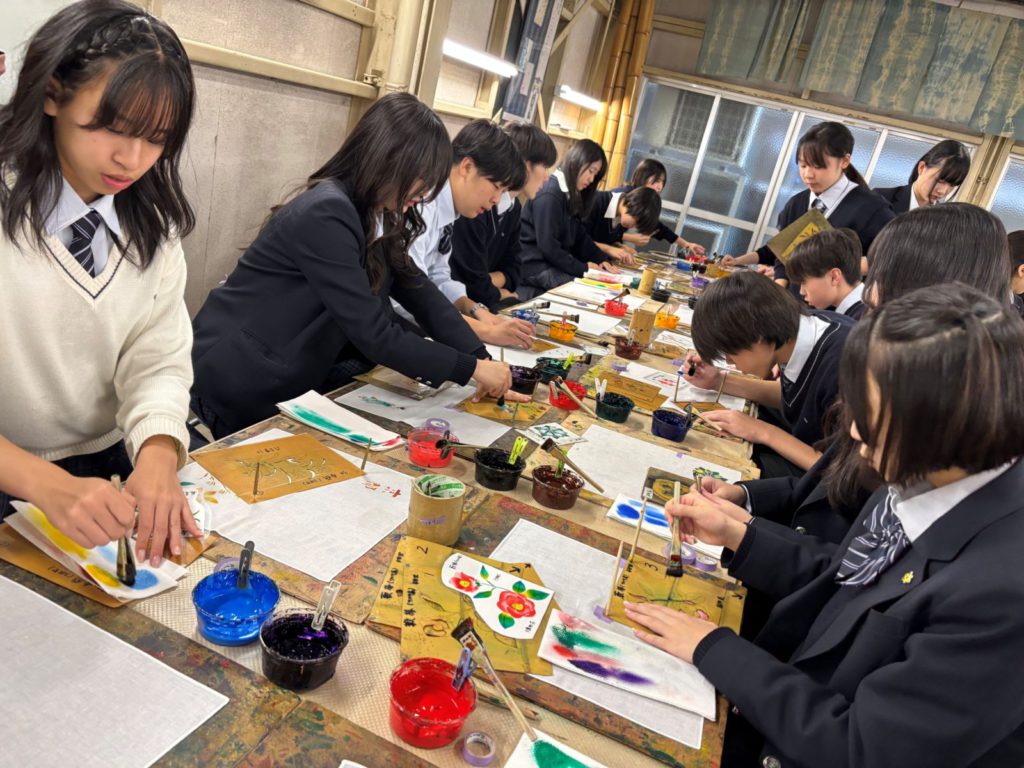 D組は友禅染めを体験するコースで、ハンカチを作りました。和気藹々とした雰囲気の中で自分オリジナルのハンカチを作ることができ、とても嬉しそうな様子でした。京都のお土産がまた一つ増え、良い記念になったと思います。