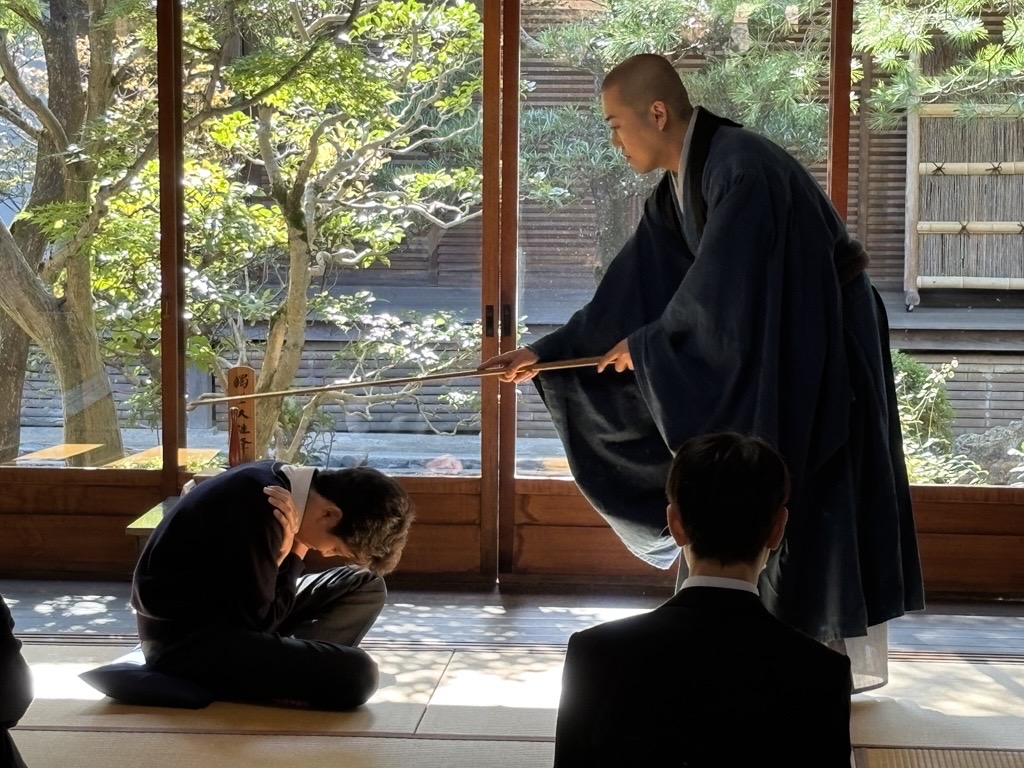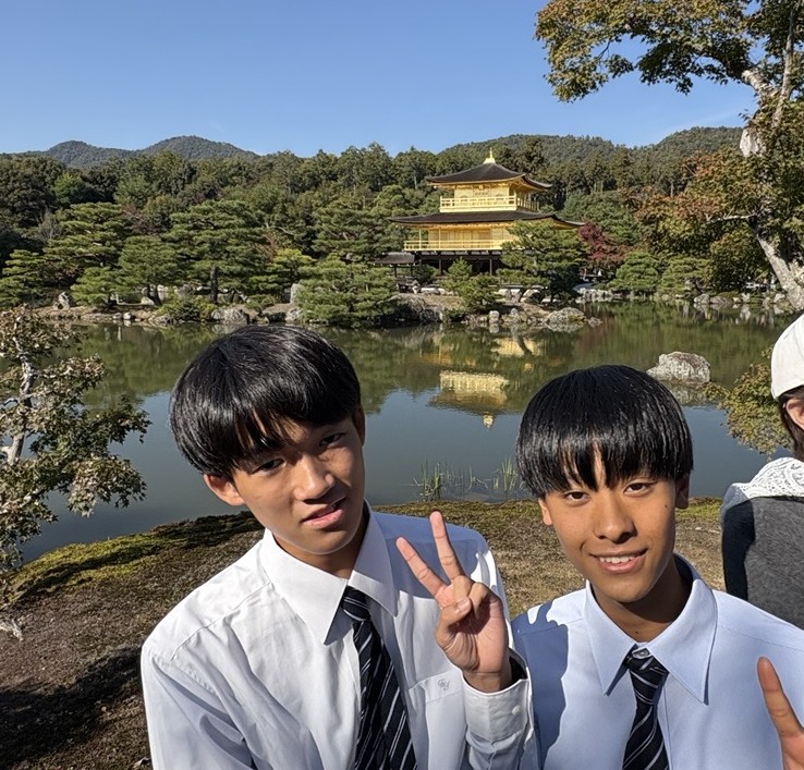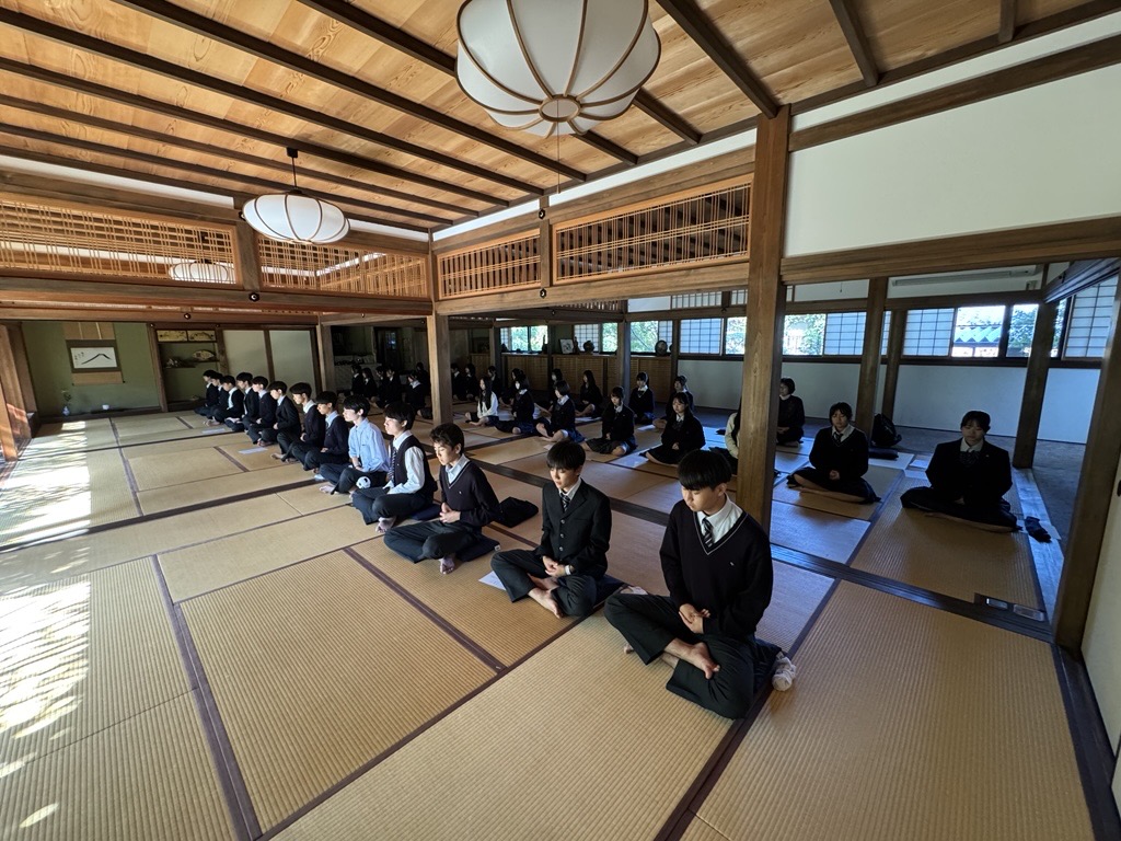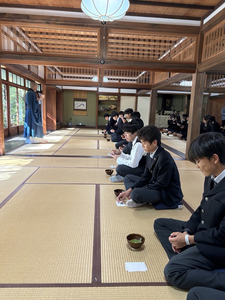 E組は妙心寺退蔵院で抹茶と座禅の体験をしました。心を清める時間は普段の学校生活とはひと味違う雰囲気となり、新鮮な気持ちで体験教室を受けることができました。その他、観光名所の金閣寺も訪問し、研修旅行の締めくくりとして印象深い時間になったと思います。