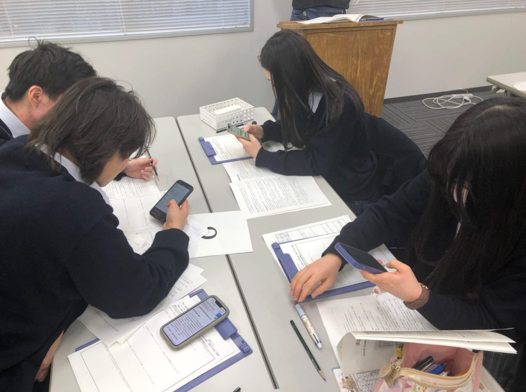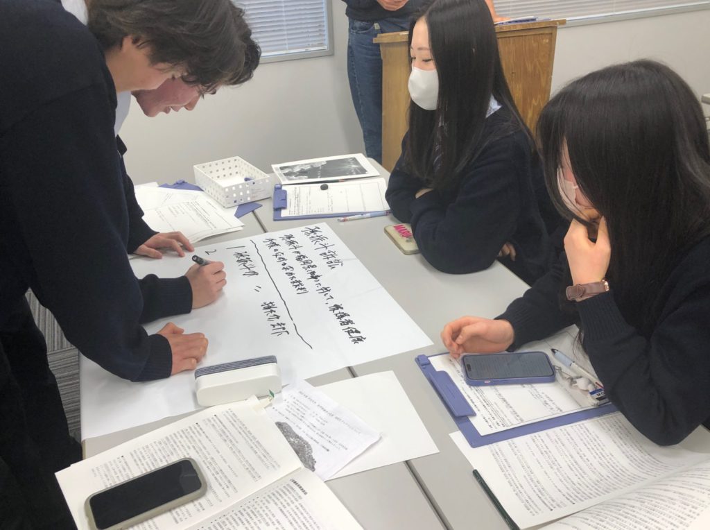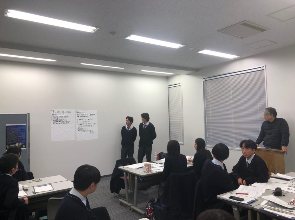 その後のアウトプットを意識するからこそ、効率的なインプットが生まれます。展示に関する資料を熱心に読みながら、同時にスマートフォンを使って関連情報を調べる生徒の熱心な姿からは、中央大学に入学後も大きく成長し続ける頼もしさが感じられます。講義教室では、ただプレゼンテーションをして終わりではなく、発表した内容をもとにさらに質問が出されます。一つのテーマをどんどん掘り下げることで真実に迫っていく、大学の研究を体感した時間でした。